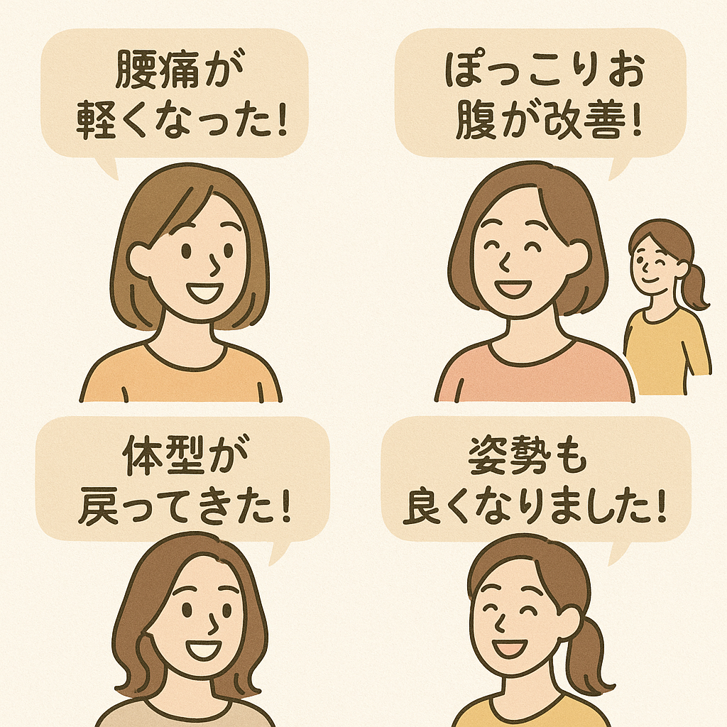 👩「産後2ヶ月で通い始めました。腰痛がひどかったのですが、数回でかなり楽に!ズボンがゆるくなってびっくりです。」