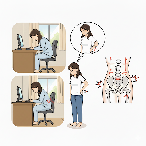 日中の姿勢不良(猫背や反り腰)が積み重なると、骨盤や背骨のバランスが崩れ、朝の動き出し時に痛みが強く出ることがあります。