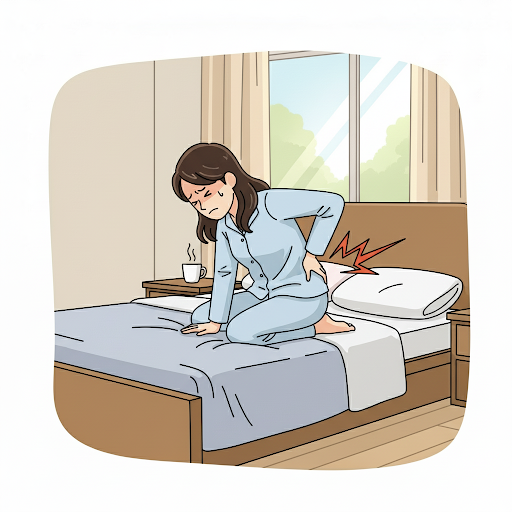 長時間同じ姿勢で寝ていると、腰周りの筋肉や関節が固まり、動き出しに痛みを感じやすくなります。特に硬い布団や不自然な寝姿勢はリスクを高めます。