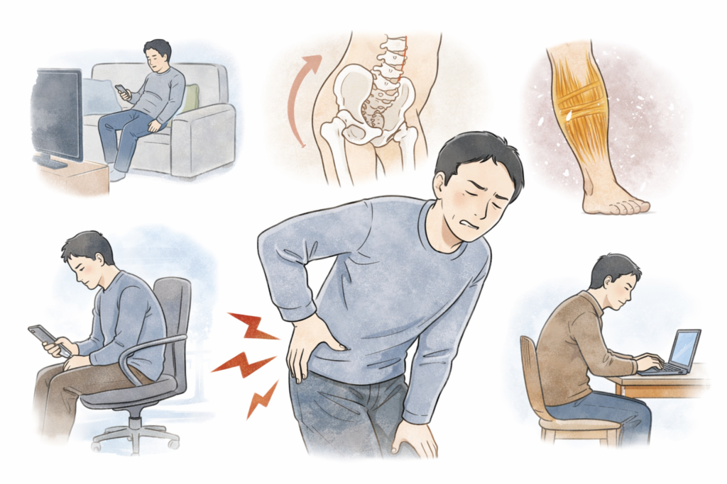 長時間の座位・運動不足・生活リズムの乱れにより