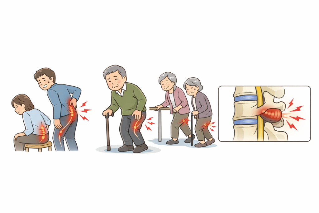 多くは「腰椎椎間板ヘルニア」や「脊柱管狭窄症」などが根本原因となっています。