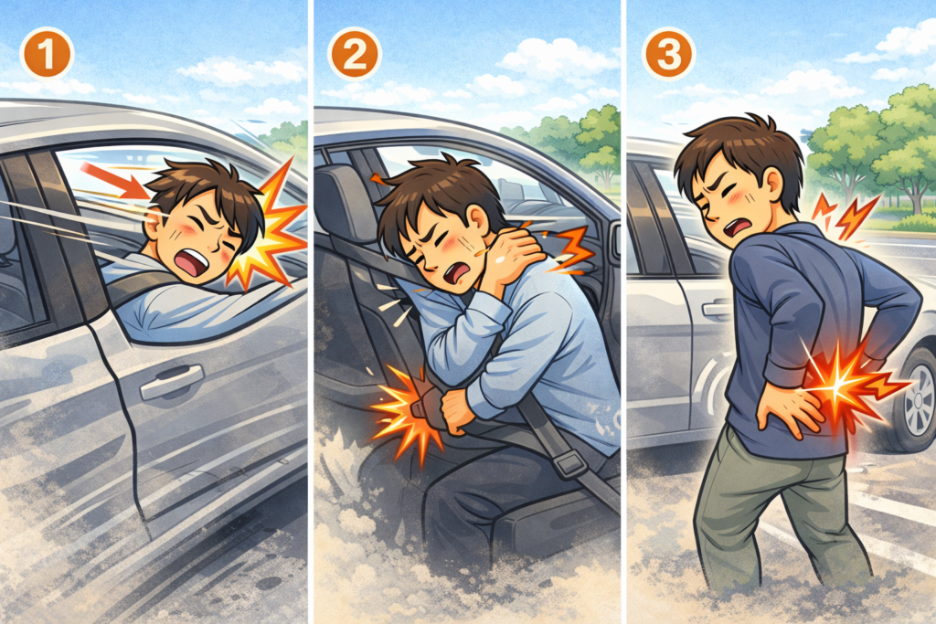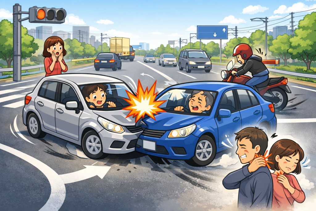 交差点での事故は衝撃方向が複雑になりやすく、事故直後は外傷が少なくても、後から首・肩・腰に不調があらわれることがあります。この記事では、交差点事故後に起こりやすい身体の変化と、早期ケアの重要性について解説します。