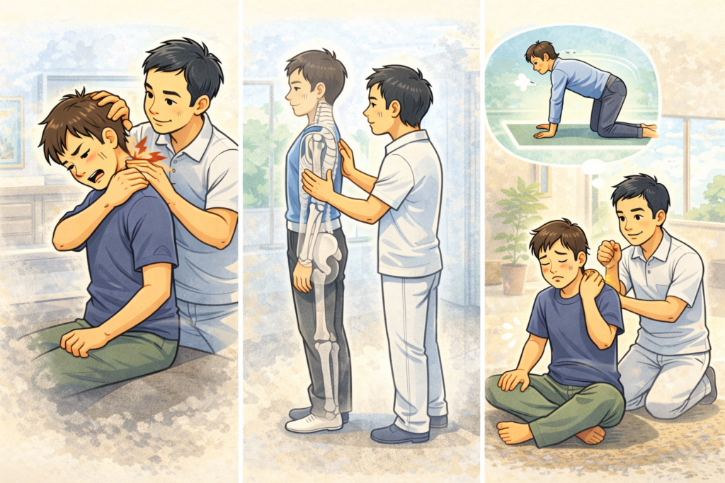事故直後の身体は非常にデリケートです。無理な矯正や強いマッサージは行わず、関節の動き・筋バランス・姿勢を確認しながら段階的に回復を目指します。