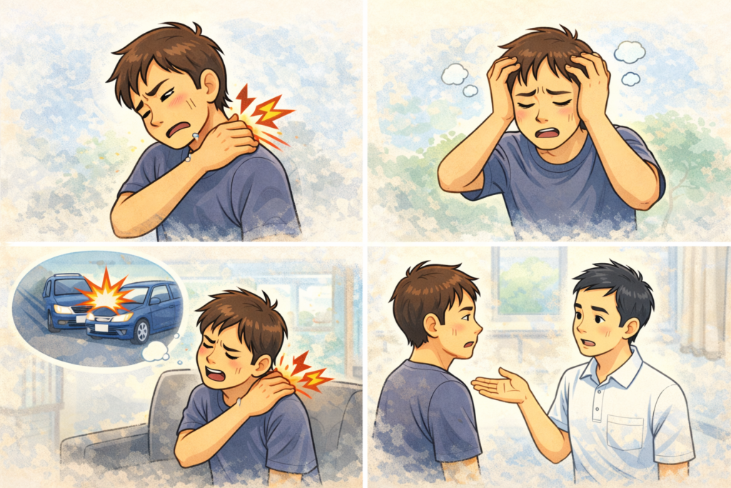 追突事故とは異なり、右折・直進時の事故は「横方向・斜め方向」からの力が首に加わることがあります。首まわりの筋肉や靭帯はねじれながら引き伸ばされ、数日後に痛み・重だるさ・頭痛として症状が出ることがあります。